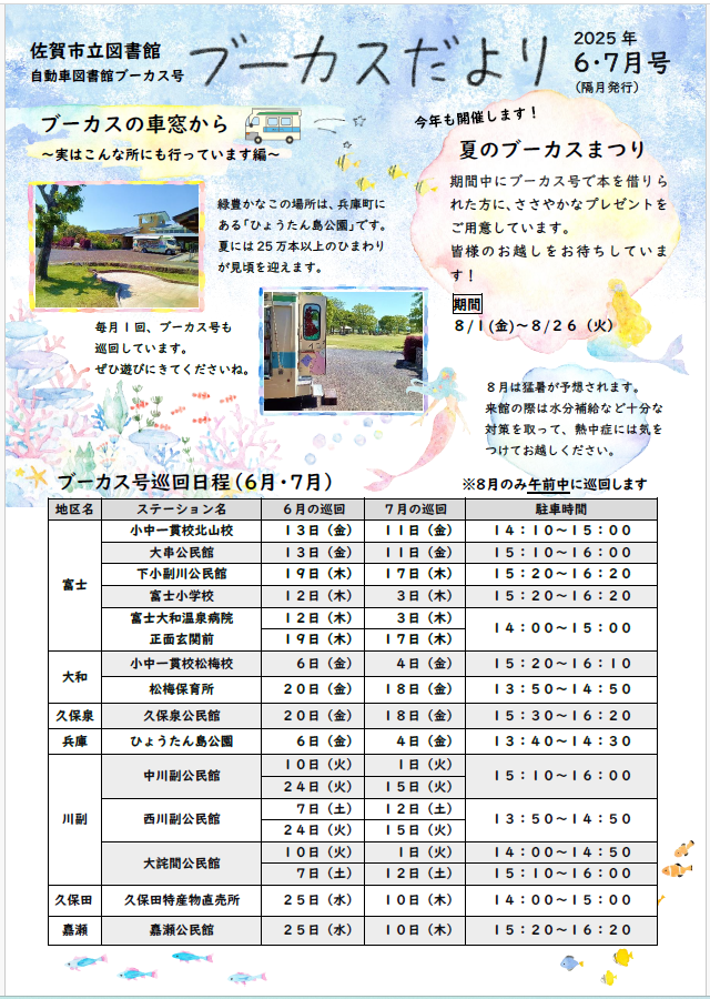新しいブーカスだよりができました 佐賀市立図書館ブーカス号では、隔月ごとに「ブーカスだより」を発行しています。巡回スケジュールや様々な情報を掲載しています。 ぜひご覧ください。 12・1月号 バックナンバー 図書館だより